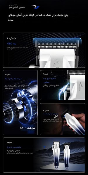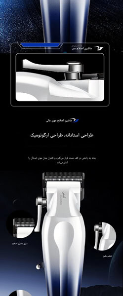علاوه بر موتور پر قدرت و کیفیت ساخت بالا، دارای ویژگی های دیگری از جمله تیغههای استیل خودتیز شونده با دوام زیاد، باتری لیتیومی با شارژدهی طولانی مدت، قابلیت استفاده همزمان با برق و باتری سیم شارژ با پورت USB برای شارژ آسان در هر مکان است، حتی با پاوربانک یا لب تاب به راحتی قابل شارژ است. عملکرد کم صدا سبب شده مشتریان ارایشگاه هایی که این ست حرفه ای در آنها استفاده شده تجربه ای آرام و بدون استرس را داشته باشند.