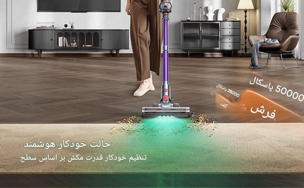 این جاروبرقی بیسیم دارای صفحه لمسی تمامرنگی و حالت هوشمند خودکار است. در این حالت، دستگاه بهصورت هوشمند سطوح مختلف از جمله فرش و کفپوش سخت را تشخیص داده و قدرت مکش را بهینه تنظیم میکند. نتیجه: تمیزی عمیقتر، مصرف انرژی کمتر و عملکرد ایدهآل برای خانههای دارای حیوانات خانگی.